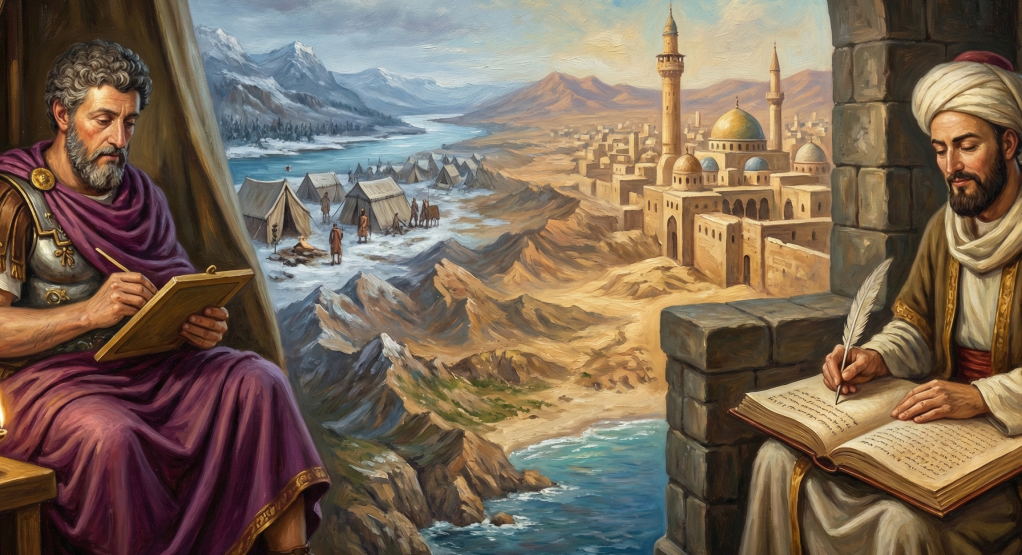 Menarik bahwa dua tokoh besar ini terpisah jarak dan waktu berbeda yang satunya di Romawi, yang satunya di Baghdad. Dalam konteks waktu yang jauh beda 900 tahun. Tetapi mereka sama-sama Menulis.