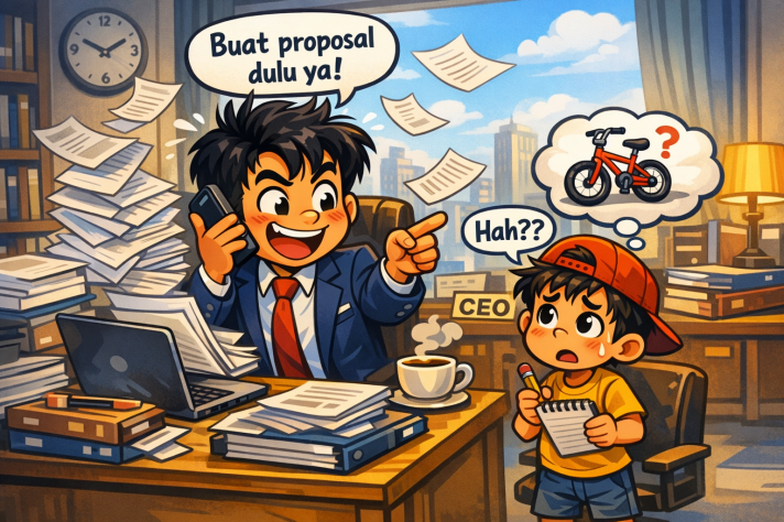 Kejadian lucu sekaligus ironis ini saya dengar di sebuah podcast. Tentang seorang CEO ternama di Malaysia, Tan Sri Zainal Abidin (mantan petinggi Perodua dan Proton). Suatu hari, beliau pulang ke rumah dalam keadaan lelah dan pikirannya penuh dengan urusan pekerjaan. Saat anaknya datang meminta sepeda, saking fokusnya beliau dengan mode kerja, beliau spontan menjawab, “Kamu buat proposalnya dulu.”