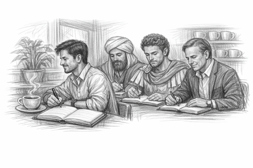 Saya tiba-tiba teringat dengan beberapa tokoh di sepanjang sejarah yang mempraktikkan hal ini. Tokoh pertama itu adalah Ibnu Athaillah as-Sakandari, seorang ulama dari Iskandariyah. Lalu tokoh kedua adalah Marcus Aurelius, Kaisar Romawi. Lalu tokoh yang terakhir, tokoh modern, yaitu Ray Dalio, mereka semua membuat buku yang awalnya ditujukan sebagai panduan untuk diri sendiri.